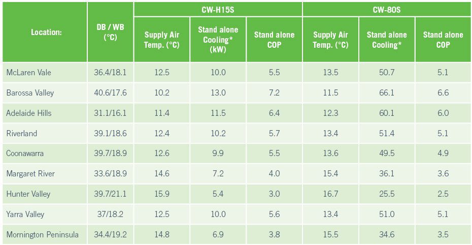 Performance table for different wine regions – stand alone cooling