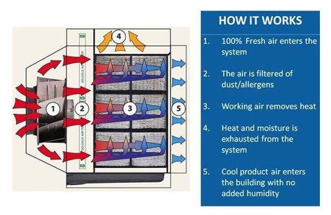 Seeley InternationalLos climatizadores evaporativos indirectos de Coolerado pueden incorporar intercambiadores de calor aire-aire de contracorriente (Climate Wizard) o de ciclo M (Coolerado).