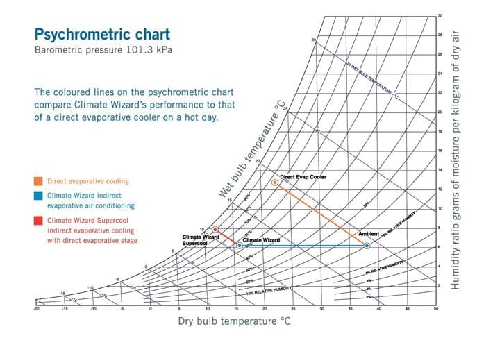 Si el enfriador es un enfriador de aire evaporativo indirecto Climate Wizard , el aire fresco pasa a través del canal seco donde es superenfriado y emerge a unos 16°C. Pero no se ha añadido humedad, ya que el proceso de enfriamiento se ha producido a lo largo de la línea de humedad constante. La "eficacia de bulbo húmedo" de los climatizadores evaporativos indirectos es de aproximadamente el 125%, mientras que los climatizadores directos normales tienen una eficacia de bulbo húmedo de aproximadamente el 85%.