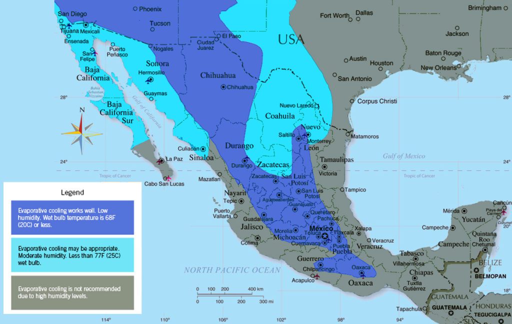 El enfriamiento evaporativo funciona especialmente bien en zonas que registran sobre todo condiciones calurosas y secas, ya que la humedad del aire suele ser baja. Esto incluye Argentina, Bolivia, Chile, Colombia, Costa Rica, Ecuador, Guatemala, Honduras, México, Nicaragua, San Salvador, Panamá y Perú. Este mapa ilustrativo de México muestra las diferentes zonas climáticas donde el enfriamiento evaporativo funciona eficazmente.