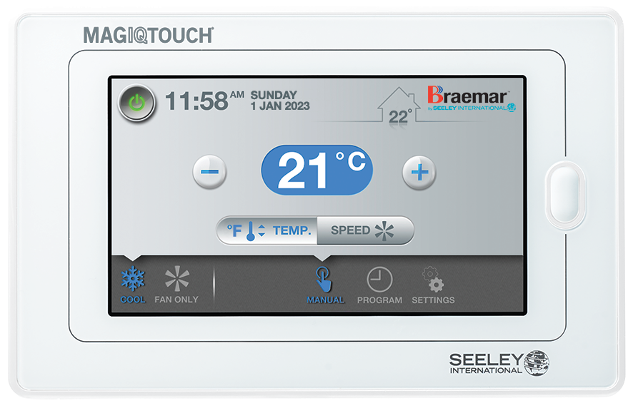 Control the temperature, fan speed and many more features on a user friendly touch screen. The discreet and modern design will blend seamlessly into the décor of your home.