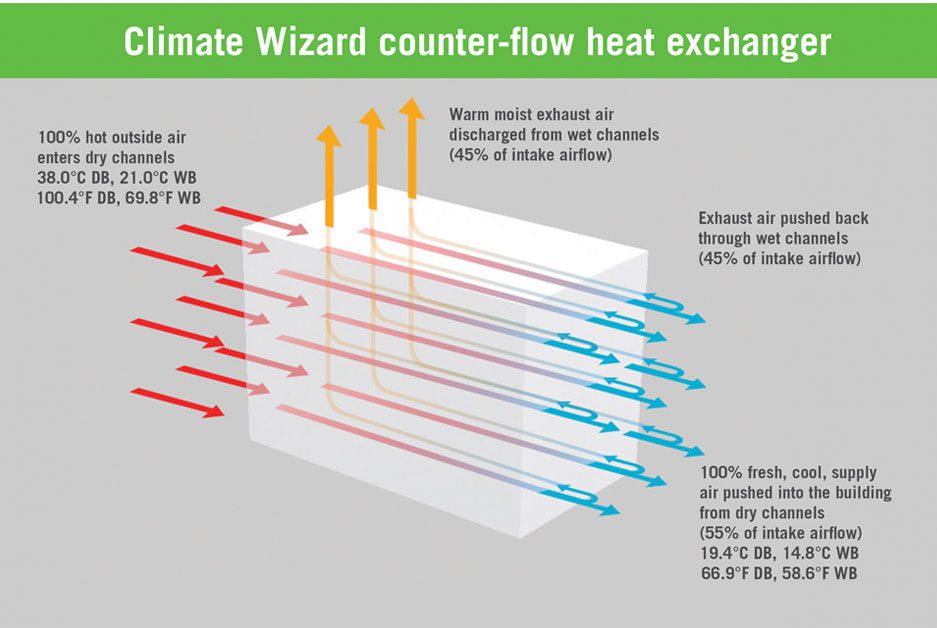 Climate Wizard provides hyper-efficient cooling of outside air and up to 80% lower energy costs* compared to equivalent refrigerated air conditioning systems, with the added benefit of supplying 100% fresh, cool air into the building, increasing Indoor Air Quality (IAQ).